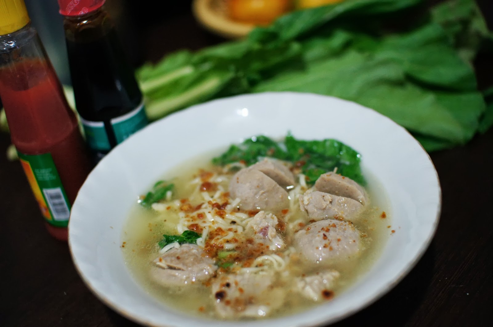 - hidangkan ala abang tukang baso: dalam mangkok tata mie, daun sawi ijo, siram dengan kuah baso, beri baso dan daging secukupnya, taburi seledri dan bawang goreng